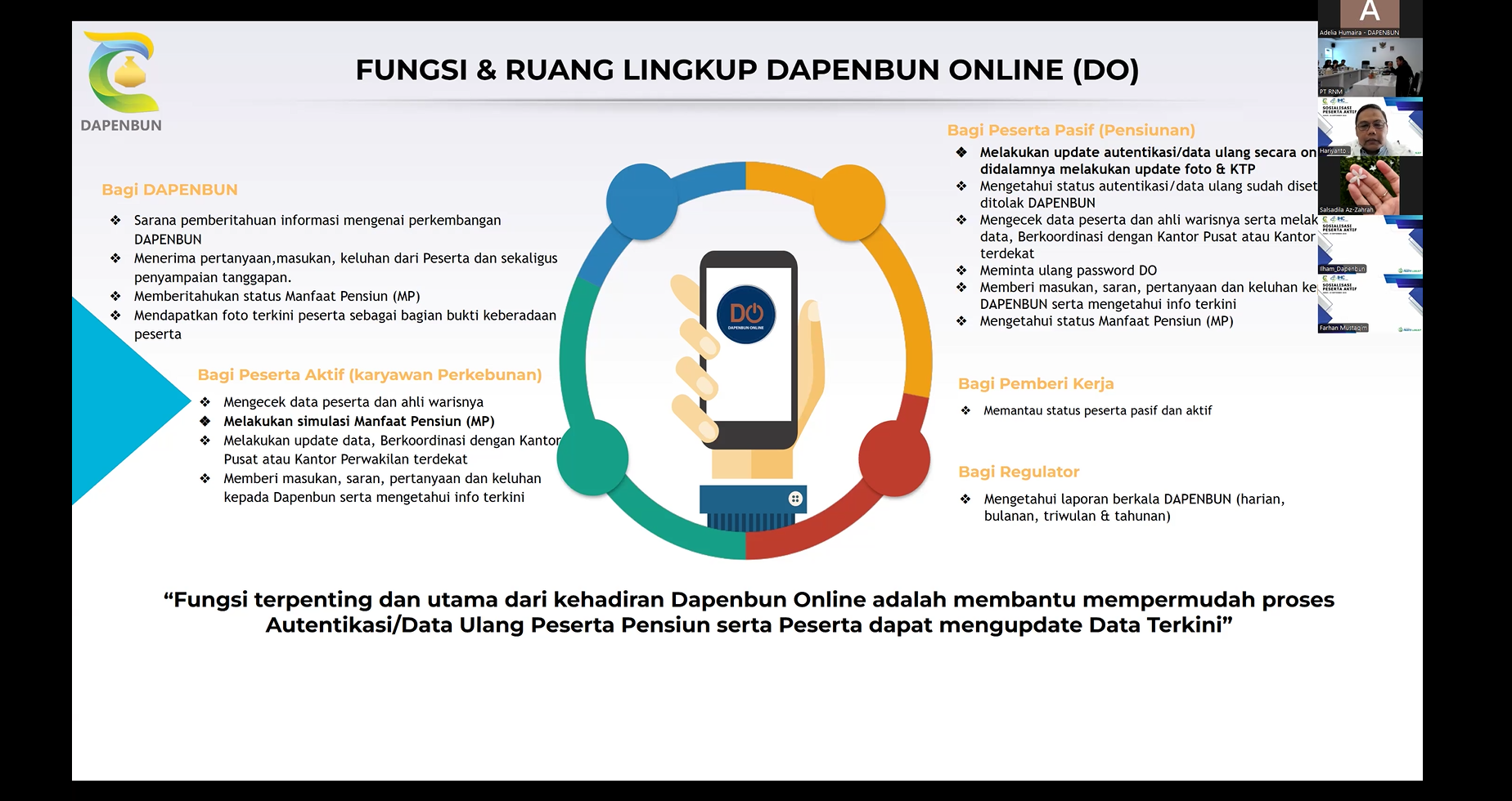 Penyampaian lebih lanjut disampaikan oleh Bapak Hariyanto selaku Kepala Bidang Teknologi Informasi melalui zoom meeting mengenai panduan penggunaan aplikasi DAPENBUN Online guna mempermudah peserta untuk melakukan autentikasi diri.