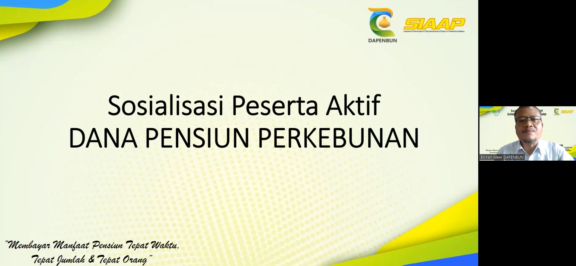 DAPENBUN mengadakan Sosialisasi Peserta Aktif PT Perkebunan Nusantara I pada Selasa, 8 November 2022. Sosialisasi ini merupakan agenda rutin yang masih terus dilaksanakan sampai saat ini melalui Zoom Meeting.