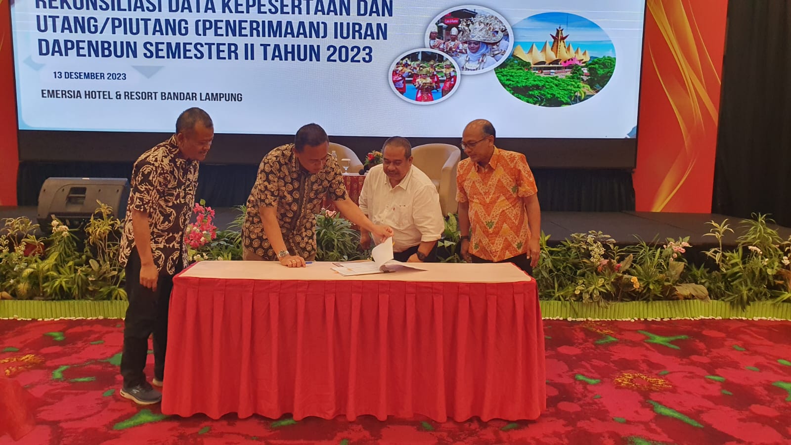 DAPENBUN menyelenggarakan Finalisasi Berita Acara Rekonsiliasi Data Kepesertaan dan Hutang Piutang Iuran Semester II Tahun 2023 pada Rabu, 13 Desember 2023 bertempat di Emersia Hotel & Resort, Bandar Lampung. Kegiatan ini merupakan puncak acara dari serangkaian kegiatan Rekonsiliasi Data yang telah dilakukan pada tanggal 4 s.d. 9 Desember 2023 secara hybrid.