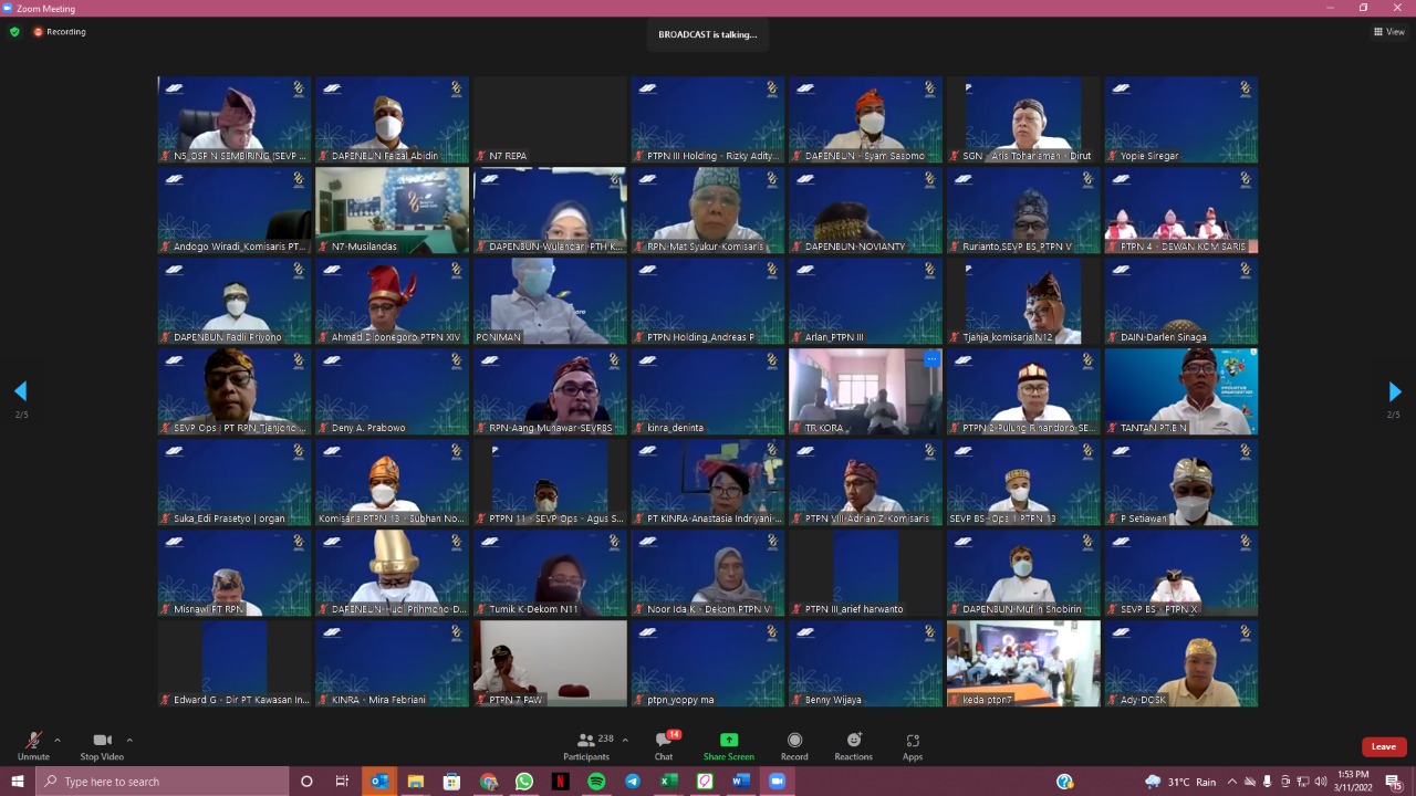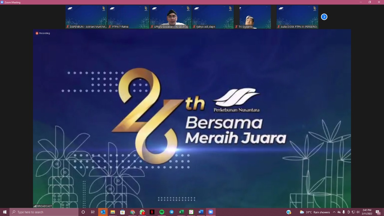 DIRGAHAYU KE-26 PT. Perkebunan Nusantara III (Persero). Pada hari jum’at, 11 Maret 2022 DAPENBUN Mengikuti Perayaan HUT ke-26 PT. Perkebunan Nusantara III (Persero) Dengan tema “Bersama Meraih Juara” secara Virtual. Dimana acara tersebut diawali dengan sambutan Bapak Mohammad Abdul Ghani selaku Direktur Utama PT. Perkebunan Nusantara III. Acara juga dihadiri oleh Komisaris Utama Bapak Zulkifli Zaini, Direktur PT. Perkebunan Nusantara I s.d XIV, SEVP PT. Perkebunan Nusantara I s.d XI dan juga diikuti seluruh Direksi DAPENBUN beserta para Kabid (Kepala Bidang).