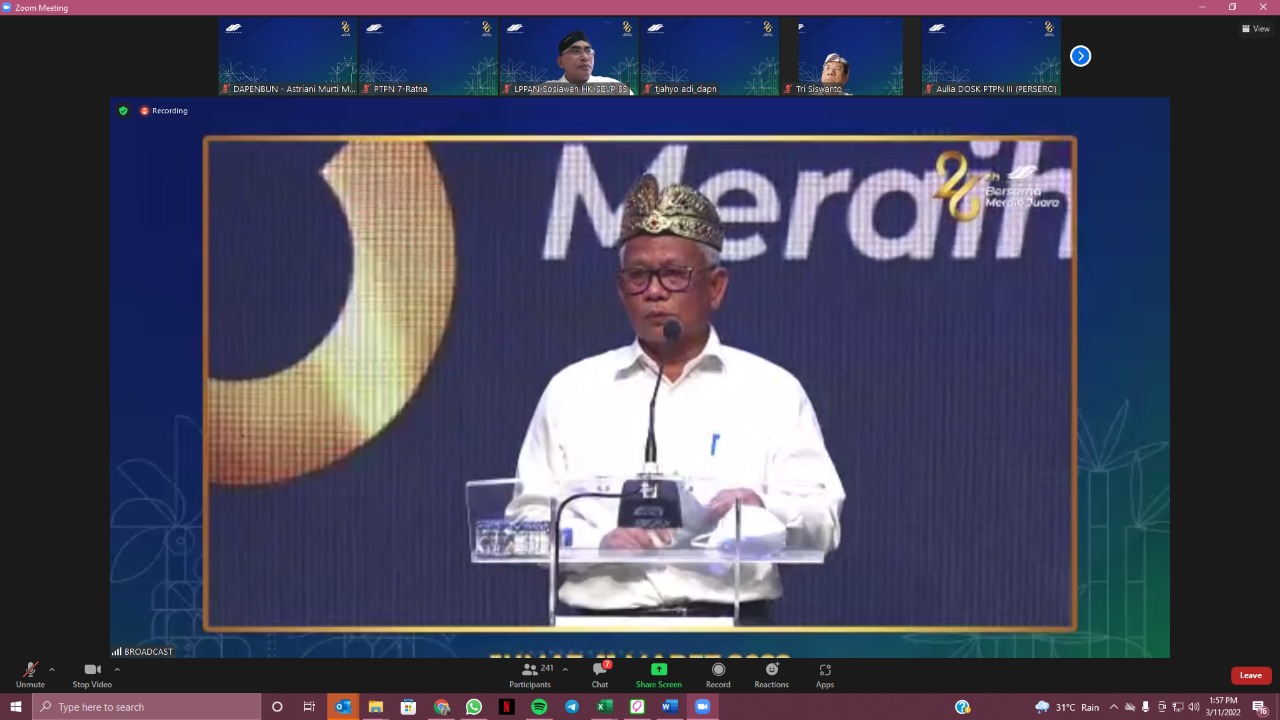 Dilanjutkan sambutan dari Bapak Zulkifli Zaini selaku Komisaris Utama PT. Perkebunan Nusantara III. “Kita telah melewati tahun 2021 dengan kinerja yang baik dan kita bangga dengan itu, antara lain restrukturisasi hutang, optimalisasi, operation excellence serta hal lain - lain” ujarnya dengan bangga. Dan dikesempatan yang sama menyampaikan apresiasi atas semua Kerja Keras dan Kerja Cerdas Direksi PTPN III (Persero), Dewan Komisaris, Board of Management PTPN III Group Serta seluruh jajaran Karyawan PTPN