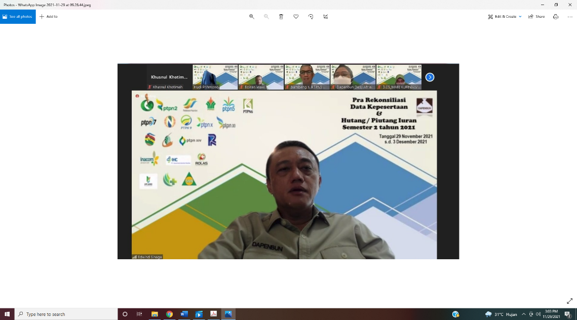 DAPENBUN melaksanakan kegiatan Pra Rekonsiliasi Data Kepesertaan & Hutang Piutang Iuran Semester 2 tahun 2021 yang dilaksanakan secara virtual. Kegiatan ini berlangsung selama 5 hari yaitu dari tanggal 29 November 2021 – 3 Desember 2021 dan diikuti oleh Pemberi Kerja PT. Perkebunan Nusantara I, II, III (Persero), IV-XIV, PT. Sarana Agro Nusantara, PT. Lembaga Pendidikan Perkebunan, PT. KPB Nusantara, PT. Riset Perkebunan Nusantara, PT. Nusantara Medika Utama, PT. Nusantara Sebelas Medika, dan PT. Rolas Nusantara Medika.