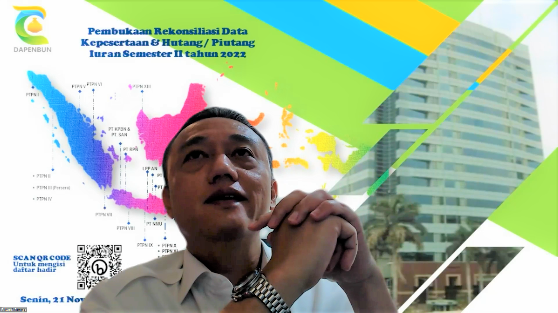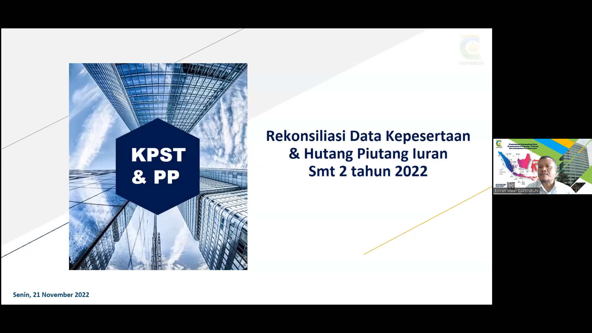 DAPENBUN menyelenggarakan kegiatan Pembukaan Rekonsiliasi Data Kepesertaan & Hutang Piutang Iuran Semester II Tahun 2022 secara virtual melalui Zoom Meeting pada Senin, 21 November 2022. Acara ini dihadiri oleh Direktur Utama Bapak Edwind Sinaga, Sekretaris DAPEN Bapak Faizal Abidin, Kepala Bidang Kepesertaan & Pelayanan Peserta Bapak Boiran Wawi, Kepala Bidang Sumber Daya Manusia & Umum Ibu Ariyani Putri, Kepala Bidang Teknologi Informasi Bapak Hariyanto, Kepala Bidang Keuangan Bapak Evin Lasmana, serta para Pemberi Kerja PT Perkebunan Nusantara I sampai dengan IV, PT Riset Perkebunan Nusatara, Lembaga Pendidikan Perkebunan, PT Sarana Agro Nusantara, PT Kharisma Pemasaran Bersama Nusantara, PT Nusantara Medika Utama, PT Nusantara Sebelas Medika, dan PT Rolas Nusantara Medika.