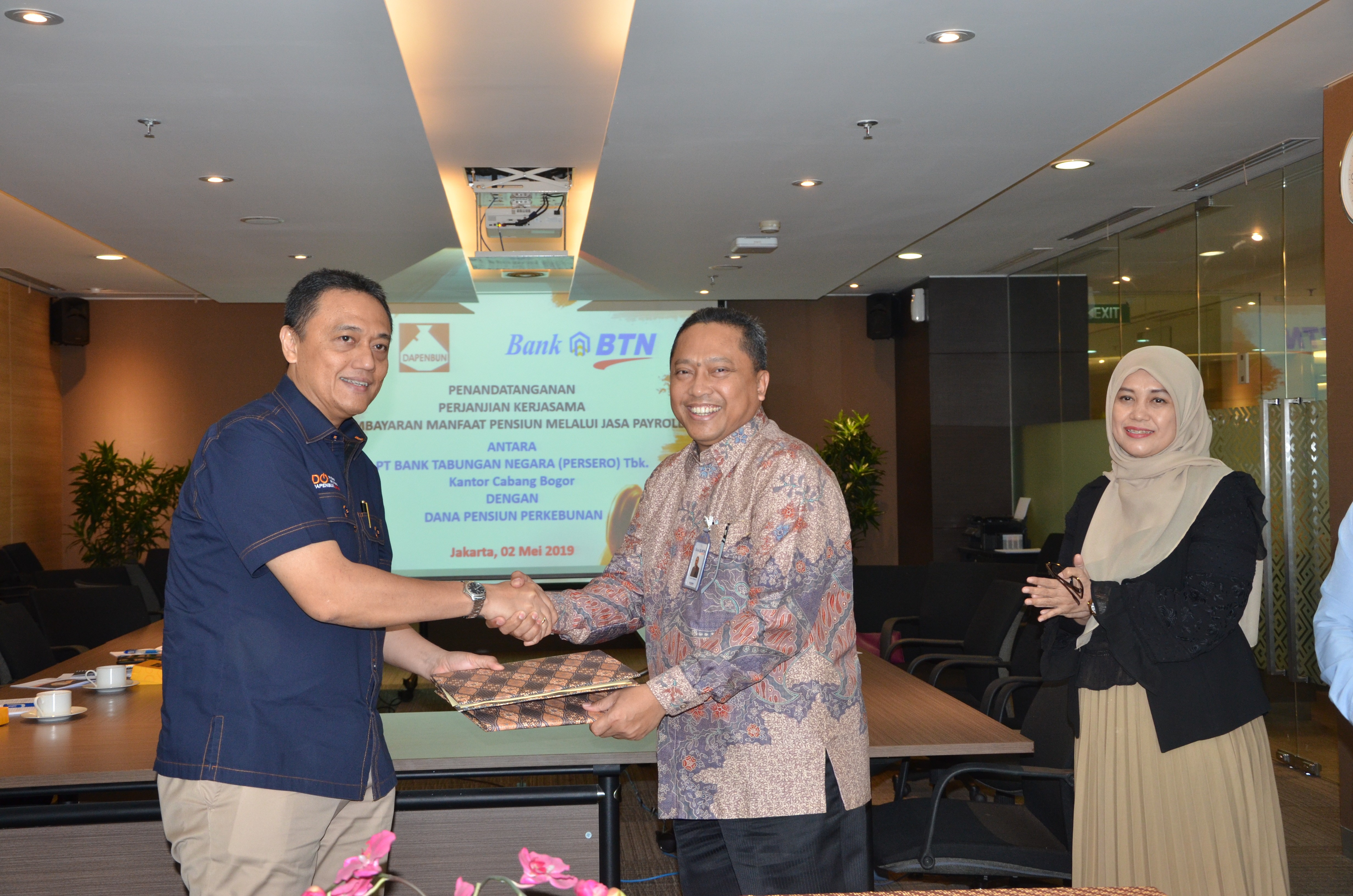Dalam rangka kerjasama pembayaran manfaat pensiun pada tanggal 2 Mei 2019 di Gedung Agro Plaza Kuningan Jakarta telah dilaksanakan Penandatanganan Perjanjian Kerjasama Pembayaran Manfaat Pensiun Melalui Jasa Payrol antara DAPENBUN dengan PT Bank BTN (Persero), Tbk Cabang Bogor. Penandatangan dilaksanakan oleh Bapak Edwind Sinaga Direktur Utama DAPENBUN, Bapak Dikdik Purwana Direktur Operasional DAPENBUN dan Bapak Slamet Purwadi Kepala Cabang Bank BTN Bogor.