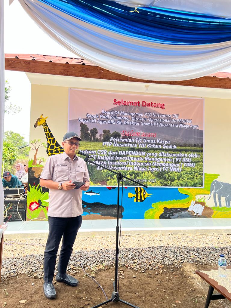 Pembangunan TK ini merupakan bentuk tanggung jawab sosial kepada masyarakat sekitar Kebun Gedeh, Cianjur, pasca terjadinya gempa bumi pada November 2022. Pembangunan dilaksanakan sejak bulan Juni 2023. “Alhamdulillah, setelah 4 bulan proses pembangunan berjalan, maka hari ini kita semua dapat meresmikan hasil pembangunan TK Tunas Karya ini,” ujar pak Hudi Prihmono selaku Direktur Operasional DAPENBUN dalam sambutannya.