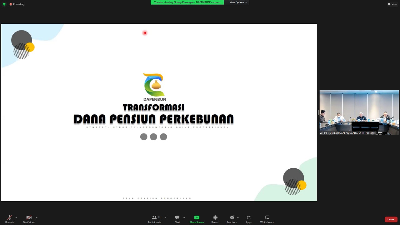 Holding Perkebunan Nusantara PTPN III (Persero) bersama dengan DAPENBUN menyelenggarakan rapat terkait Paparan dari Manajemen DAPENBUN tentang Program Transformasi dan Dukungan yang Dibutuhkan pada Rabu, 26 Oktober 2022. Acara dilaksanakan secara offline di Kantor Holding Perkebunan Nusantara PTPN III (Persero) dan online melalui Zoom Meeting.