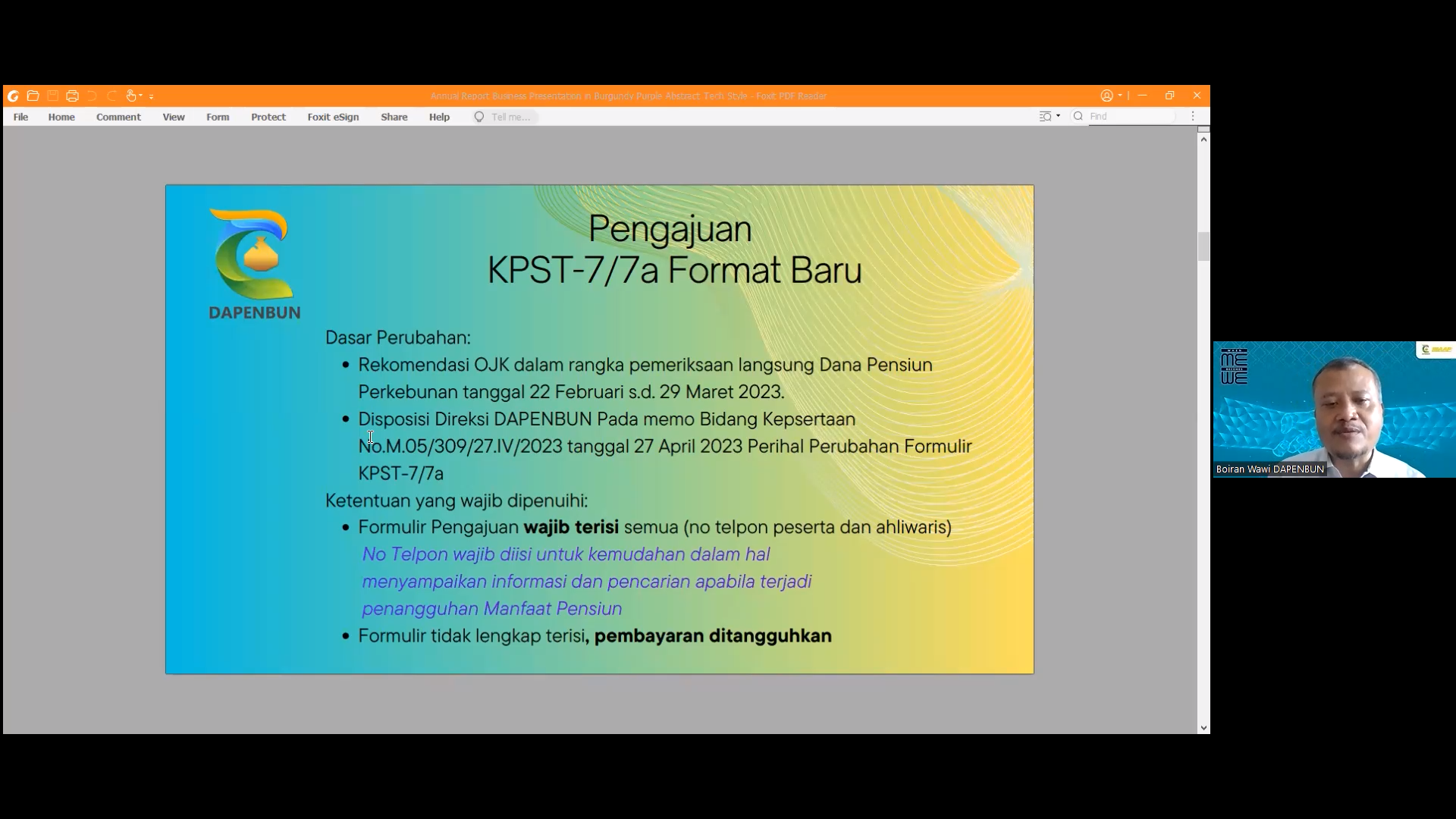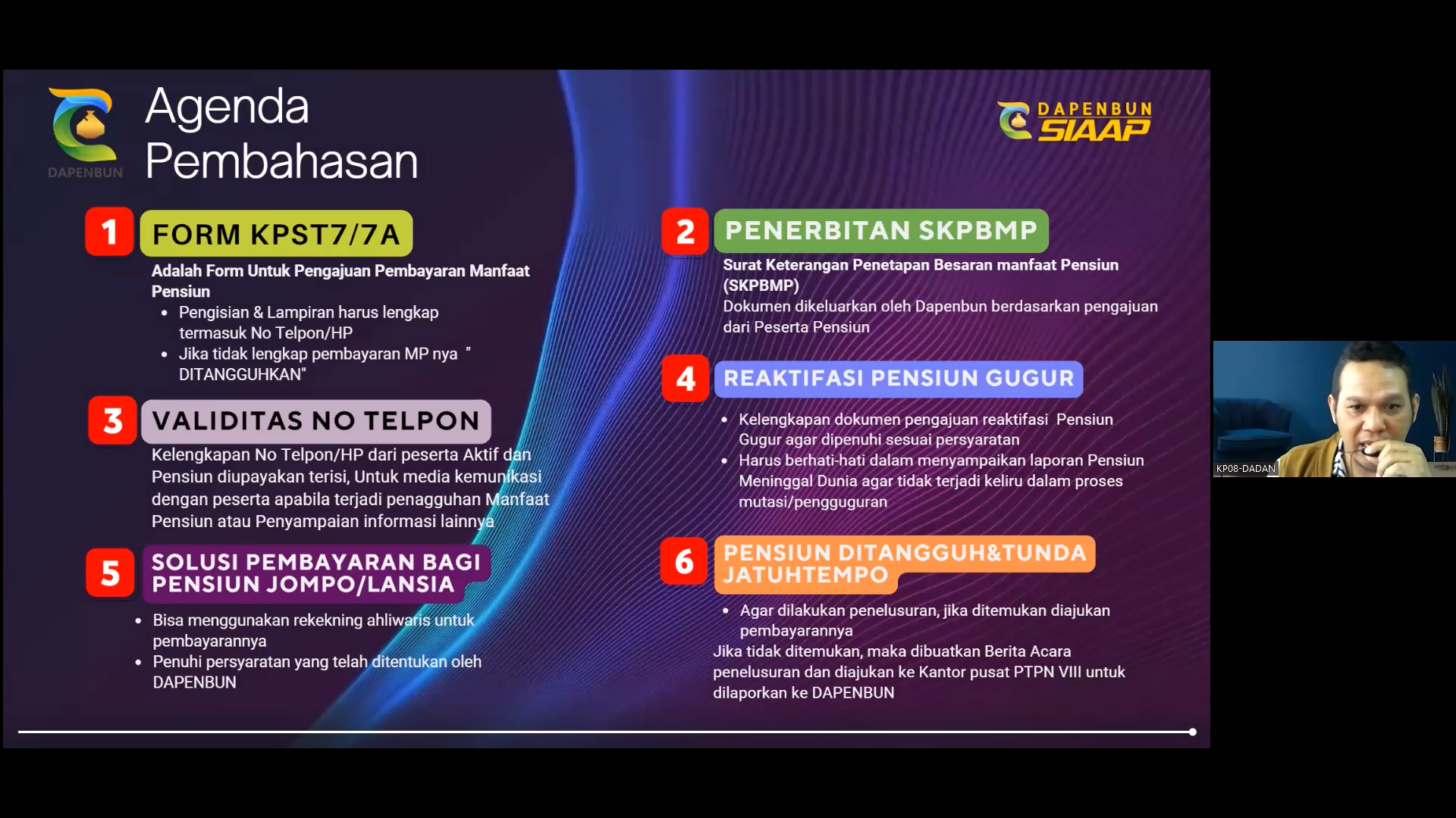 DAPENBUN mengadakan Sosialisasi Kepesertaan PTPN VIII pada Selasa, 16 Mei 2023 secara daring melalui Zoom Meeting.
