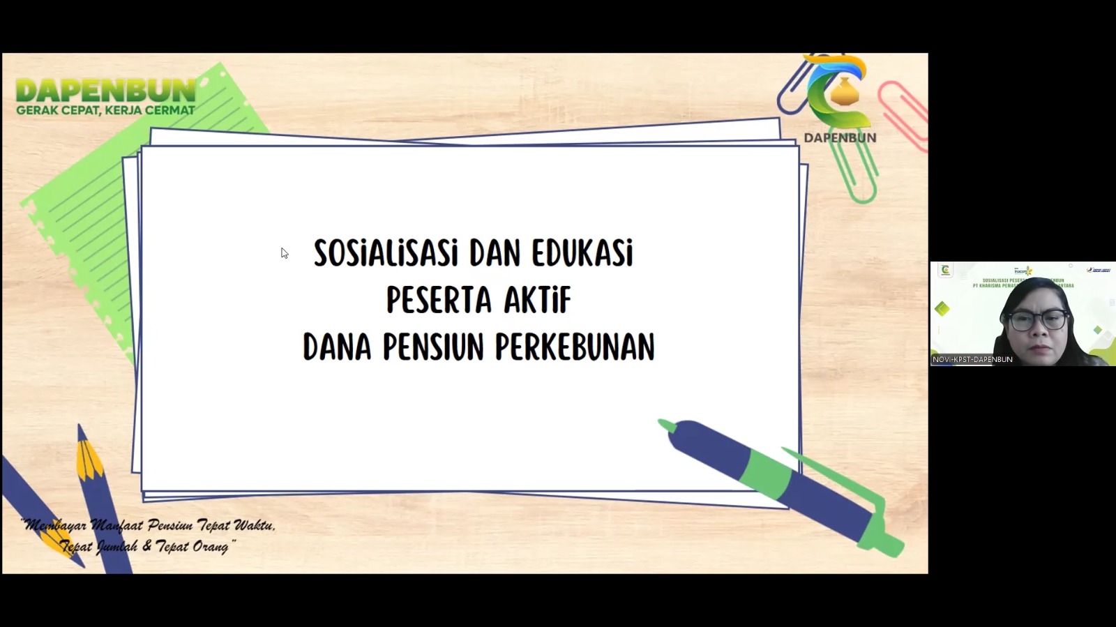 Sebagai bentuk pelayanan informasi kepada Peserta, DAPENBUN menyelenggarakan Sosialisasi Peserta Aktif PT Kharisma Pemasaran Bersama Nusantara (KPBN) pada Senin, 28 Oktober 2024 secara daring melalui Zoom Meeting.