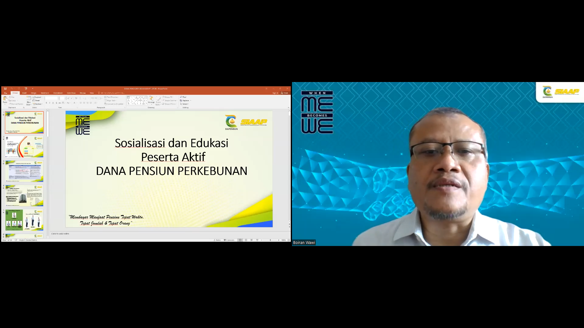 Sebagai bentuk pelayanan terhadap peserta, DAPENBUN kembali menyelenggarakan Sosialisasi Peserta Aktif PT Kharisma Pemasaran Bersama Nusantara (PT KPBN) pada Selasa, 17 Oktober 2023 melalui Zoom Meeting. Sosialisasi ini merupakan Sosialisasi Peserta Aktif yang ke-19 di tahun 2023.