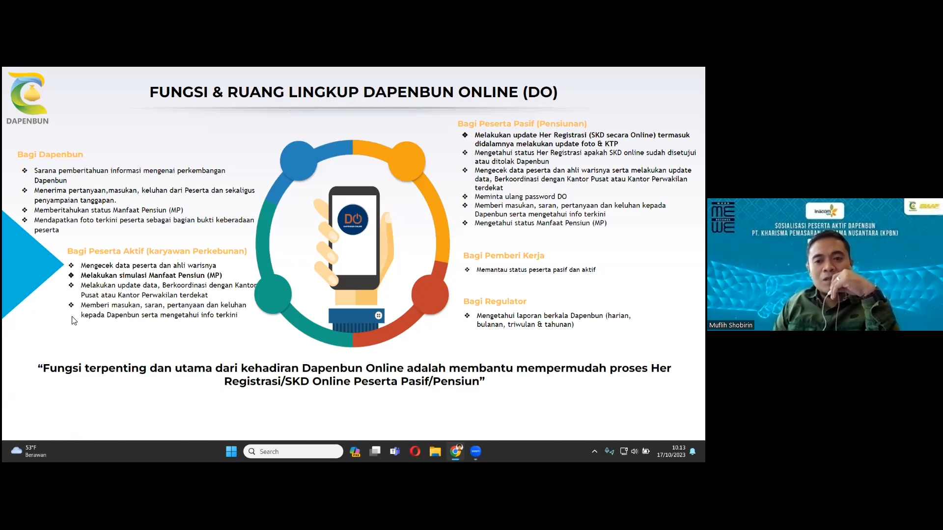 Lebih lanjut lagi, Bapak Muflih Shobirin selaku Kepala Urusan Pemeliharaan Teknologi Informasi menyampaikan panduan penggunaan aplikasi DAPENBUN Online. Guna memudahkan para peserta untuk melakukan Her Registrasi Data Ulang agar manfaat pensiun dapat terbayarkan secara tepat waktu, tepat jumlah, dan tepat orang.