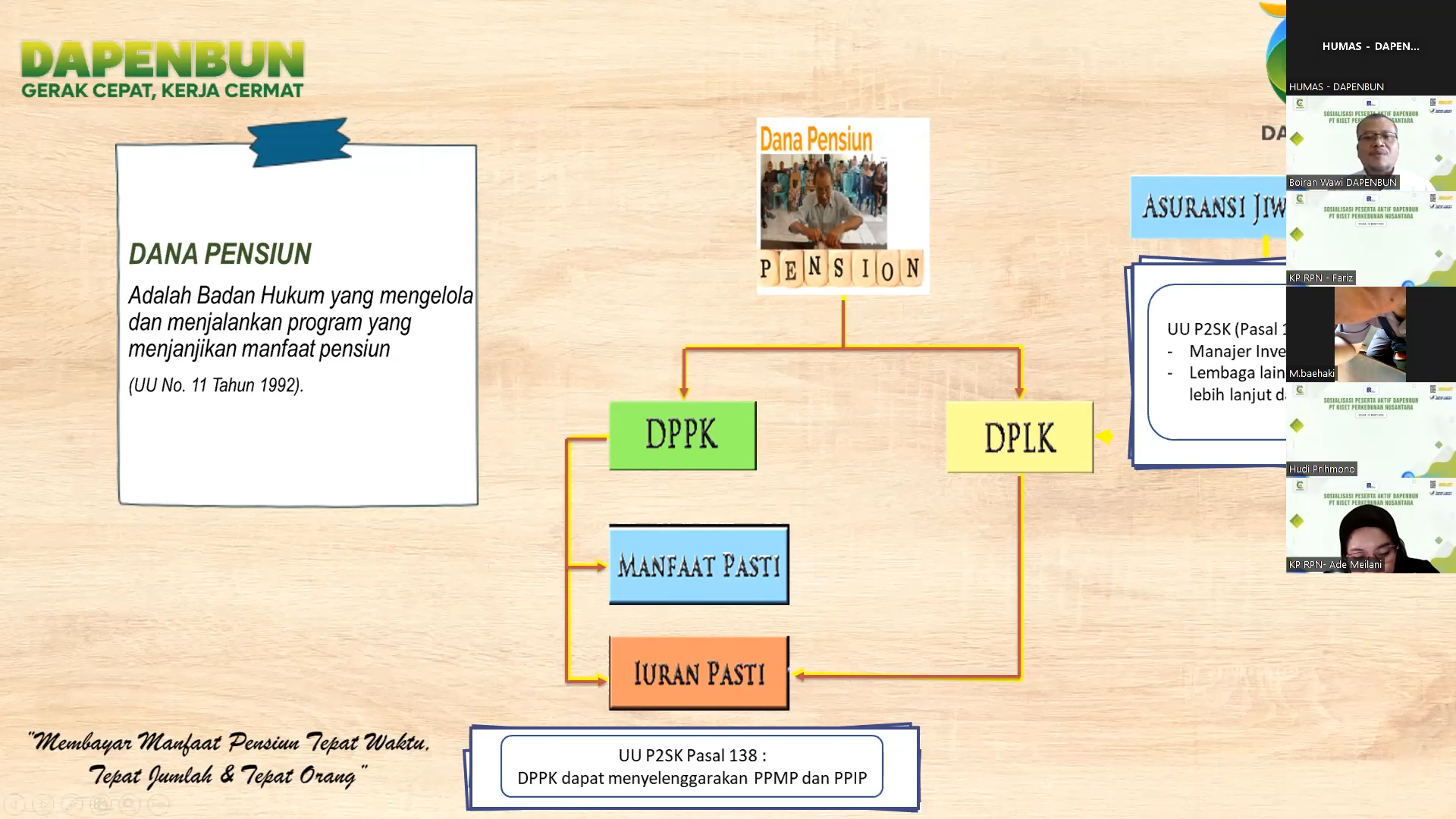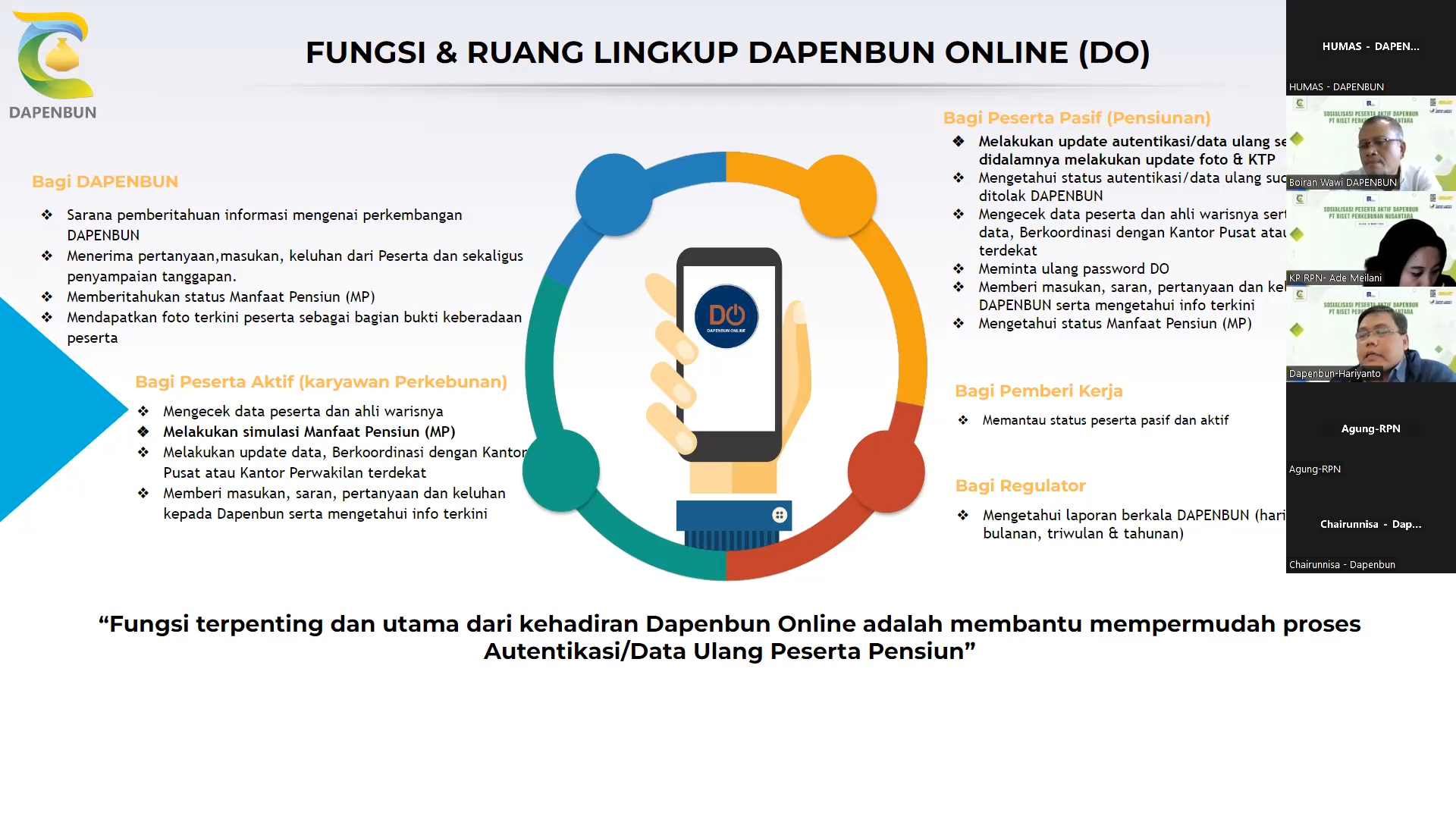 Informasi inti disampaikan oleh Kepala Bidang Kepesertaan dan Pelayanan Peserta Bapak Boiran Wawi mengenai gambaran umum DAPENBUN, perhitungan manfaat pensiun, tata cara perolehan manfaat pensiun serta cara perhitungannya. Kemudian dilanjutkan pemaparan oleh Kepala Bidang Teknologi Informasi Bapak Hariyanto mengenai aplikasi DAPENBUN Online, guna memudahkan para Peserta untuk melakukan autentikasi diri secara online.
