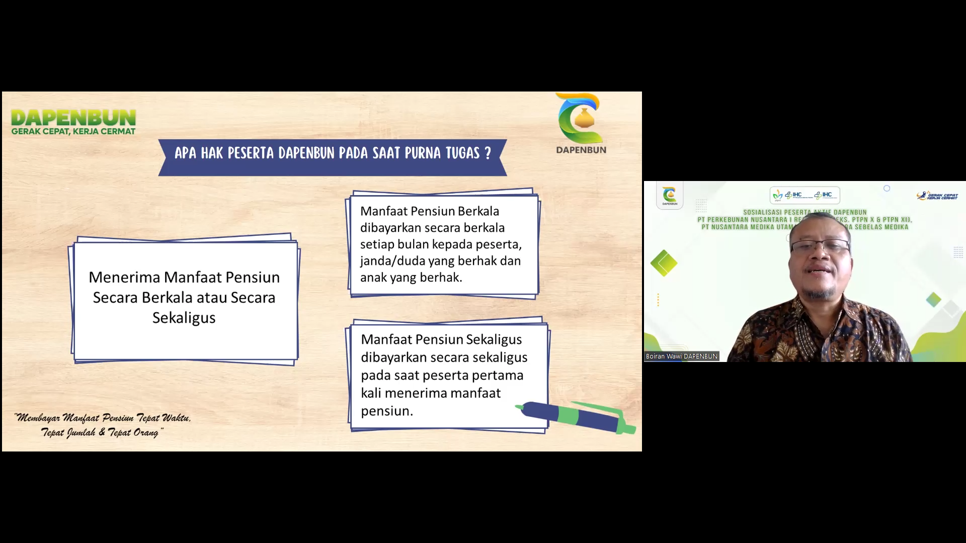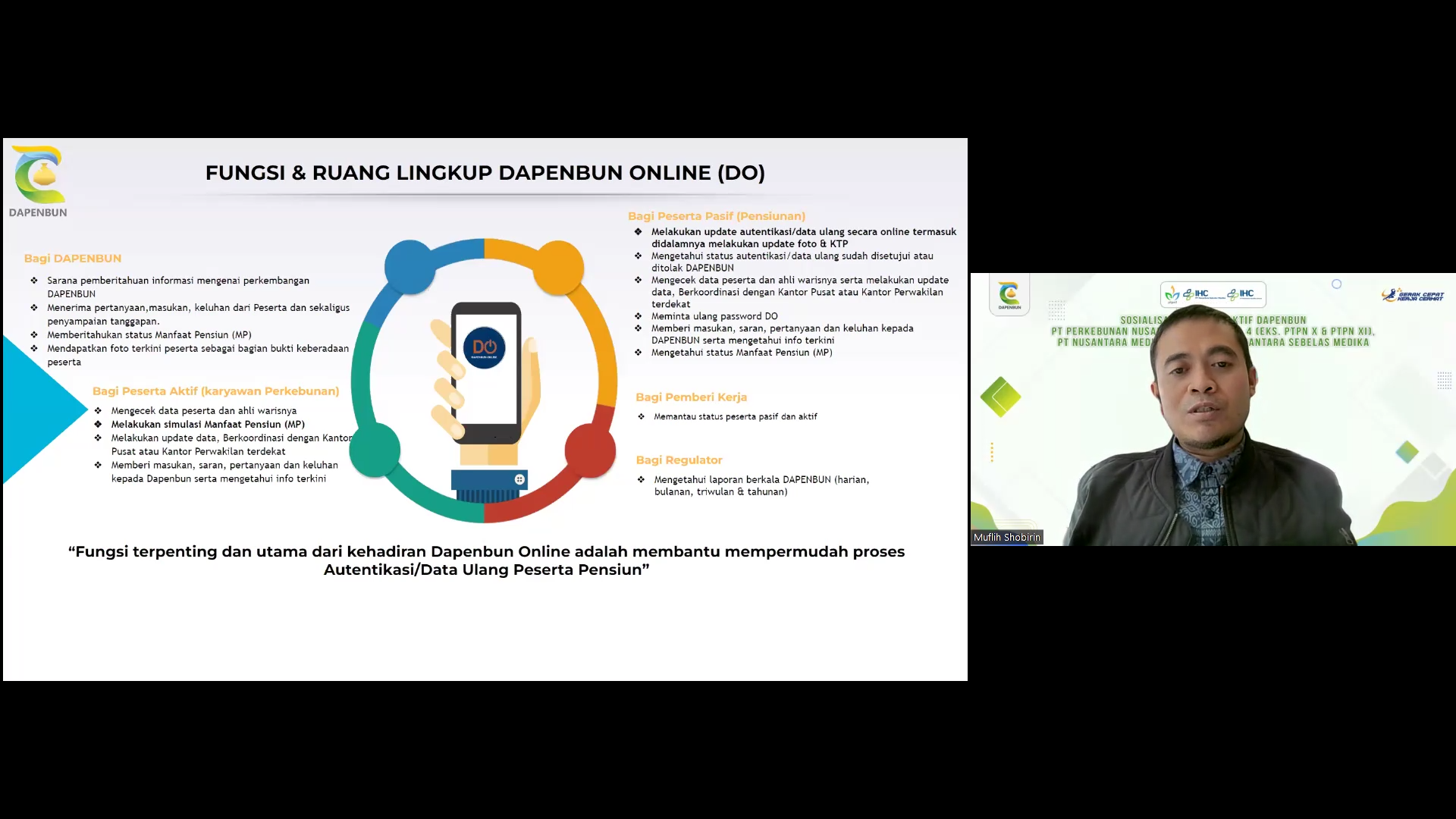 Kemudian dilanjutkan oleh pemaparan Kepala Urusan Pemeliharaan TI Bapak Muflih Shobirin mengenai aplikasi DAPENBUN Online, guna memudahkan para Peserta untuk melakukan autentikasi diri secara online.