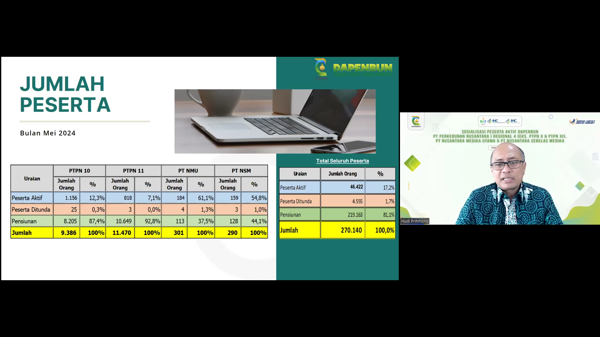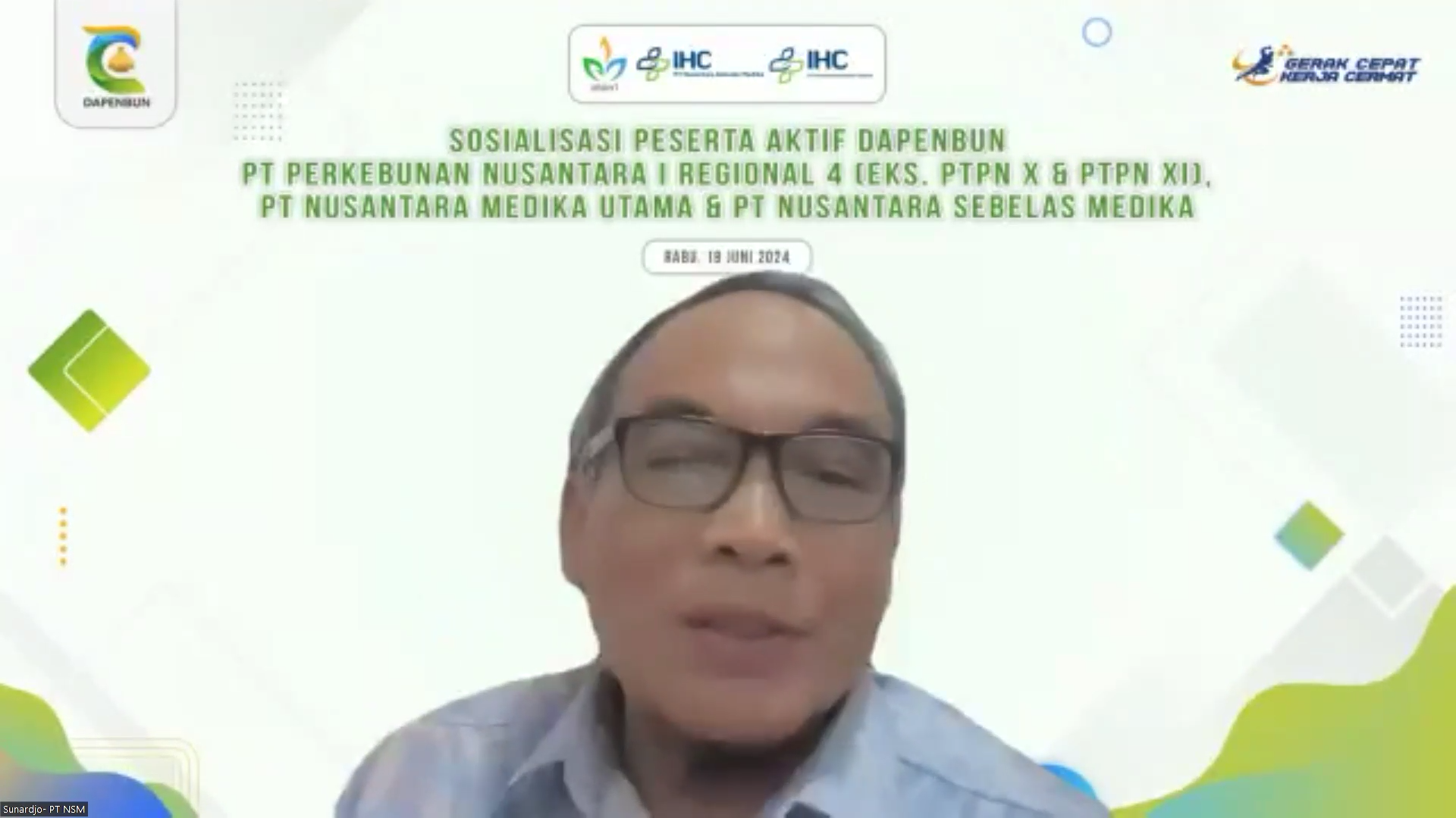 DAPENBUN menyelenggarakan Sosialisasi Peserta Aktif PT Perkebunan Nusantara I Regional 4, PT Nusantara Sebelas Medika (PT NSM), dan PT Nusantara Medika Utama (PT NMU) pada pada Rabu, 19 Juni 2024 secara daring melalui Zoom Meeting.