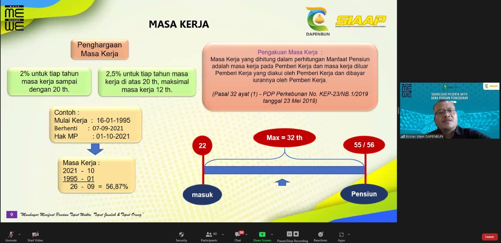 Dalam rangka pembekalan pengetahuan tentang hak dan kewajiban para calon peserta pensiun, DAPENBUN menyelenggarakan Sosialisasi Peserta Aktif PTPN XIV pada hari Selasa, 14 Maret 2023. Kegiatan sosialisasi ini rutin dilakukan sampai saat ini secara virtual melalui Zoom Meeting.
