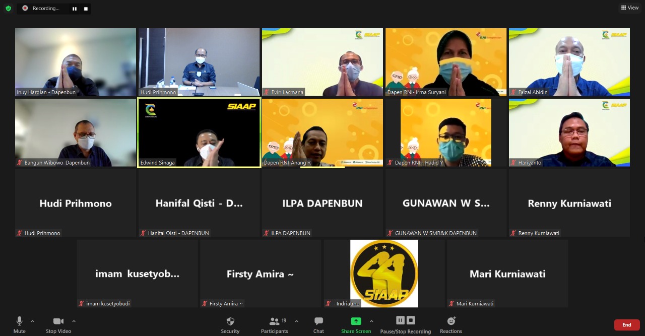 Dapen PT Rajawali Nusantara Indonesia (Dapen RNI) melakukan study banding melalui zoom dengan Dana Pensiun Perkebunan (DAPENBUN). Dengan tujuan dapat mempelajari bisnis proses investasi dan kepesertaan di DAPENBUN.