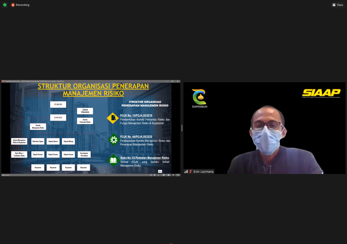 Selanjutnya Kepala Satuan Manajemen Risiko & Kepatuhan DAPENBUN Bapak Evin Lasmana, memaparkan Sistem Manajemen Risiko DAPENBUN, bagaimana melakukan pemetaan risiko dan mitigasi yang harus dilakukan.